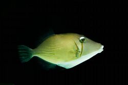 The Lei Triggerfish shares a similar body plan as other triggerfish species in the Balistidae Family, which include a rectangular body, pectoral, anal, caudal, dorsal and pelvic fins; and a toothy snout that is more reminiscent of a beak. It grows to a size of 25 cm in length. The Lei Triggerfish is generally pale, but it can change to a darker color, typically a shade of brown with hints of purple on the anal, ventral, and caudal fins. A single white strip runs down from its mouth to the base of its pectoral fin while two stripes, which are either brown or yellow depending on the mood of the fish, run down vertically. One stripe goes through the eye and the other behind the eye along the gills on either side.