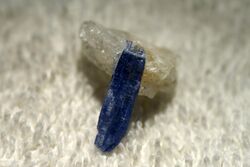 Kyanite is a typically blue aluminosilicate mineral, found in aluminium-rich metamorphic pegmatites and sedimentary rock. It is the high pressure polymorph of andalusite and sillimanite, and the presence of kyanite in metamorphic rocks generally indicates metamorphism deep in the Earth's crust. Kyanite is also known as disthene or cyanite.[5]