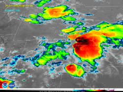 Clouds with high and cold tops, such as cyclones or cumulonimbus clouds, are often displayed as red or black, lower warmer clouds such as stratus or stratocumulus are displayed as blue or grey, with intermediate clouds shaded accordingly. Hot land surfaces are shown as dark-grey or black. One disadvantage of infrared imagery is that low cloud such as stratus or fog can have a temperature similar to the surrounding land or sea surface and does not show up. However, using the difference in brightness of the IR4 channel (10.3–11.5 μm) and the near-infrared channel (1.58–1.64 μm), low cloud can be distinguished, producing a fog satellite picture. The main advantage of infrared is that images can be produced at night, allowing a continuous sequence of weather to be studied.