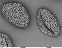 Pollen apertures are regions of the pollen wall that may involve exine thinning or a significant reduction in exine thickness.[10] They allow shrinking and swelling of the grain caused by changes in moisture content. The process of shrinking the grain is called harmomegathy.[11] Elongated apertures or furrows in the pollen grain are called colpi (singular: colpus) or sulci (singular: sulcus). Apertures that are more circular are called pores. Colpi, sulci and pores are major features in the identification of classes of pollen.[12] Pollen may be referred to as inaperturate (apertures absent) or aperturate (apertures present). The aperture may have a lid (operculum), hence is described as operculate.[13] However the term inaperturate covers a wide range of morphological types, such as functionally inaperturate (cryptoaperturate) and omniaperturate.[8] Inaperaturate pollen grains often have thin walls, which facilitates pollen tube germination at any position.[10] Terms such as uniaperturate and triaperturate refer to the number of apertures present (one and three respectively). Spiraperturate refers to one or more apertures being spirally shaped.