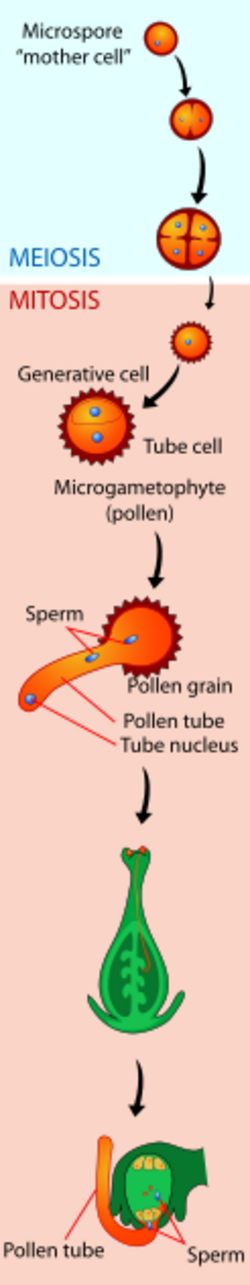 Pollen itself is not the male gamete.[4] It is a gametophyte, something that could be considered an entire organism, which then produces the male gamete. Each pollen grain contains vegetative (non-reproductive) cells (only a single cell in most flowering plants but several in other seed plants) and a generative (reproductive) cell. In flowering plants the vegetative tube cell produces the pollen tube, and the generative cell divides to form the two sperm nuclei.
