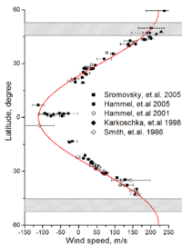 The tracking of numerous cloud features allowed determination of zonal winds blowing in the upper troposphere of Uranus.[1] At the equator winds are retrograde, which means that they blow in the reverse direction to the planetary rotation. Their speeds are from −100 to −50 m/s.[1][7] Wind speeds increase with the distance from the equator, reaching zero values near ±20° latitude, where the troposphere's temperature minimum is located.[1][13] Closer to the poles, the winds shift to a prograde direction, flowing with its rotation. Wind speeds continue to increase reaching maxima at ±60° latitude before falling to zero at the poles.[1] Wind speeds at −40° latitude range from 150 to 200 m/s. Because the collar obscures all clouds below that parallel, speeds between it and the south pole are impossible to measure.[1] In contrast, in the northern hemisphere maximum speeds as high as 240 m/s are observed near +50 degrees of latitude.[1][7] These speeds sometimes lead to incorrect assertions that winds are faster in the northern hemisphere. In fact, latitude per latitude, winds are slightly slower in the northern part of Uranus, especially at the midlatitudes from ±20 to ±40 degrees.[1] There is currently no agreement about whether any changes in wind speed have occurred since 1986,[1][7][14] and nothing is known about much slower meridional winds.[1]