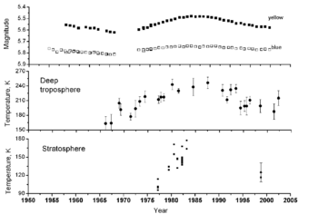 Determining the nature of this seasonal variation is difficult because good data on Uranus's atmosphere has existed for less than one full Uranian year (84 Earth years).[15] A number of discoveries have however been made. Photometry over the course of half a Uranian year (beginning in the 1950s) has shown regular variation in the brightness in two spectral bands, with maxima occurring at the solstices and minima occurring at the equinoxes.[16] A similar periodic variation, with maxima at the solstices, has been noted in microwave measurements of the deep troposphere begun in the 1960s.[17] Stratospheric temperature measurements beginning in the 1970s also showed maximum values near 1986 solstice.[18]