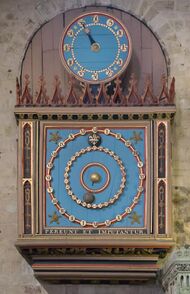 The first mechanical clocks in the 14th century, if they had dials at all, showed all 24 hours using the 24-hour analog dial, influenced by astronomers' familiarity with the astrolabe and sundial and by their desire to model the Earth's apparent motion around the Sun. In Northern Europe these dials generally used the 12-hour numbering scheme in Roman numerals but showed both a.m. and p.m. periods in sequence. This is known as the double-XII system and can be seen on many surviving clock faces, such as those at Wells and Exeter.