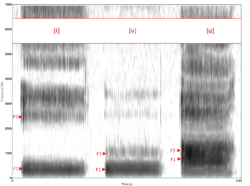 In speech science and phonetics, a formant is the broad spectral maximum that results from an acoustic resonance of the human vocal tract.[1][2] In acoustics, a formant is usually defined as a broad peak, or local maximum, in the spectrum.[3][4] For harmonic sounds, with this definition, the formant frequency is sometimes taken as that of the harmonic that is most augmented by a resonance. The difference between these two definitions resides in whether "formants" characterise the production mechanisms of a sound or the produced sound itself. In practice, the frequency of a spectral peak differs slightly from the associated resonance frequency, except when, by luck, harmonics are aligned with the resonance frequency.