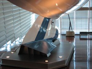Australia II was designed by Ben Lexcen, built by Steve Ward, owned by Alan Bond and skippered by John Bertrand. Lexcen's Australia II design featured a reduced waterline length and a short chord winged keel which gave the boat a significant advantage in manoeuvrability and heeling moment (lower ballast centre of gravity) but it was a significant disadvantage in choppy seas. The boat was also very quick in stays.[2] The winged keel was a major design advance, and its legality was questioned by the New York Yacht Club. During the summer of 1983, as selection trials took place for the Cup defence that autumn, the New York Yacht Club challenged the legality of the keel design. The controversy was decided in Australia II's favour.[3]