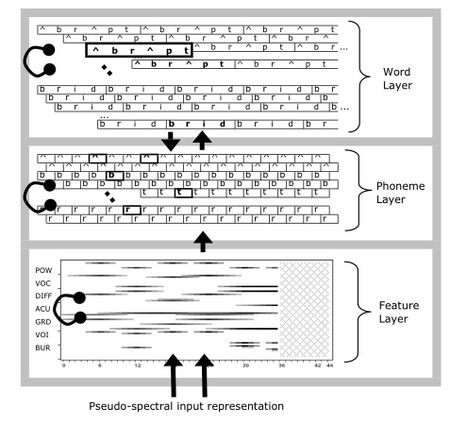 TRACE’s relevance to the modularity debate has recently been brought to the fore by Norris, Cutler and McQueen’s (2001) report on the Merge (?) model of speech perception.[8] While it shares a number of features with TRACE, a key difference is the following. While TRACE permits word units to feedback activation to the phoneme level, Merge restricts its processing to feed-forward connections. In the terms of this debate, TRACE is considered to violate the principle of information encapsulation, central to modularity, when it permits a later stage of processing (words) to send information to an earlier stage (phonemes). Merge advocates for modularity by arguing that the same class of perceptual phenomena that is accounted for in TRACE can be explained in a connectionist architecture that does not include feedback connections. Norris et al. point out that when two theories can explain the same phenomenon, parsimony dictates that the simpler theory is preferable.