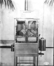 Doctors took an increasing role in childbirth from the eighteenth century onward. However, the care of newborn babies, sick or well, remained largely in the hands of mothers and midwives. Some baby incubators, similar to those used for hatching chicks, were devised in the late nineteenth century. In the United States, these were shown at commercial exhibitions, complete with babies inside, until 1931. Dr A. Robert Bauer MD at Henry Ford Hospital in Detroit, MI, successfully combined oxygen, heat, humidity, ease of accessibility, and ease of nursing care in 1931.[20] It was not until after the Second World War that special-care baby units (SCBUs, pronounced scaboo) were established in many hospitals. In Britain, early SCBUs opened in Birmingham and Bristol, the latter set up with only £100. At Southmead Hospital, Bristol, initial opposition from obstetricians lessened after quadruplets born there in 1948 were successfully cared for in the new unit.
