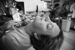 There are multiple ways to manage pain for infants. If the mother is able to help, holding the infant in kangaroo position or breastfeeding can help calm the baby[32] before a procedure is done. Other simple things that can help ease pain include; allowing the infant to suck on a gloved finger, gently binding the limbs in a flexed position, and creating a quiet and comfortable environment.[33]