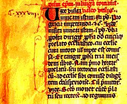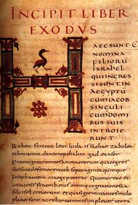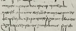 The half-uncial hand was introduced in Ireland along with Latin culture in the 5th century by priests and laymen from Gaul, fleeing before the barbarian invasions. It was adopted there to the exclusion of the cursive, and soon took on a distinct character. There are two well established classes of Irish writing as early as the 7th century: a large round half-uncial hand, in which certain majuscule forms frequently appear, and a pointed hand, which becomes more cursive and more genuinely minuscule. The latter developed out of the former.[67] One of the distinguishing marks of manuscripts of Irish origin is to be found in the initial letters, which are ornamented by interlacing, animal forms, or a frame of red dots. The most certain evidence, however, is provided by the system of abbreviations and by the combined square and cuneiform appearance of the minuscule at the height of its development.[68] The two types of Irish writing were introduced in the north of Great Britain by the monks, and were soon adopted by the Anglo-Saxons, being so exactly copied that it is sometimes difficult to determine the origin of an example. Gradually, however, the Anglo-Saxon writing developed a distinct style, and even local types,[69] which were superseded after the Norman conquest by the Carolingian minuscule. Through St Columbanus and his followers, Irish writing spread to the continent, and manuscripts were written in the Irish hand in the monasteries of Bobbio Abbey and St Gall during the 7th and 8th centuries.