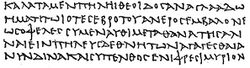 The uncial hand lingered on, mainly for liturgical manuscripts, where a large and easily legible script was serviceable, as late as the 12th century, but in ordinary use it had long been superseded by a new type of hand, the minuscule, which originated in the 8th century, as an adaptation to literary purposes of the second of the types of Byzantine cursive mentioned above. A first attempt at a calligraphic use of this hand, seen in one or two manuscripts of the 8th or early 9th century,[23] in which it slopes to the right and has a narrow, angular appearance, did not find favour, but by the end of the 9th century a more ornamental type, from which modern Greek script descended, was already established. It has been suggested that it was evolved in the Monastery of Stoudios at Constantinople.[24] In its earliest examples it is upright and exact but lacks flexibility; accents are small, breathings square in formation, and in general only such ligatures are used as involve no change in the shape of letters. The single forms have a general resemblance (with considerable differences in detail) both to the minuscule cursive of late papyri, and to those used in modern Greek type; uncial forms were avoided.