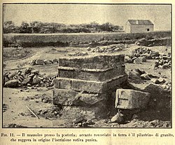 During the 1911 excavations of the city of Olbia (then named "Terranova Pausania") led by Antonio Taramelli, the fragments of a small pyramid-shaped arula were found on a rectangular pillar next to "tower B". The pillar was found to have a Punic inscription on its granite base. It was found in a location where a tomb was erected in Roman times.[3]