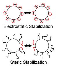 Another of the major applications of polyelectrolyte adsorption is the stabilization (or destabilization) of solid colloidal suspensions, or sols. Particles in solution tend to have attractive forces similar to van der Waals forces, modeled by Hamaker theory. These forces tend to cause colloidal particles to aggregate or flocculate. The Hamaker attractive effect is balanced by one or both of two repulsive effects of colloids in solution. The first is electrostatic stabilization, in which like charges of the particles repel one another. This effect is due to the zeta potential that exists due to a particle's surface charge in solution.[12] The second is steric stabilization, due to steric effects. Drawing particles together with adsorbed polymer chains greatly decreases the conformational entropy of the polymer chains at the surface, which is thermodynamically unfavorable, making flocculation and coagulation more difficult.