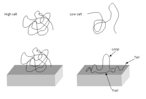 High salt concentrations cause conditions similar to the interactions experienced by a polymer in a favorable solvent. Polyelectrolytes, while charged, are still mainly non-polar with carbon backbones. While the charges on the polymer backbone exert an electrostatic force that drives the polymer into a more open and loose conformation, if the surrounding solution has a high concentration of salt, then the charge repulsion will be screened. Once this charge is screened the polyelectrolyte will act as any other non-polar polymer would in a high ionic strength solution and begin to minimize interactions with the solvent. This leads to a much more clumped and dense polymer deposited onto the surface.