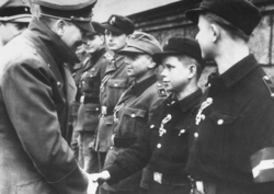 German desperation in the final hours of the war led to more crimes against their own people. The Nazi government started using child soldiers to defend itself, largely drawn from the ranks of the Hitler Youth. Those young boys were not spared from summary execution as punishment for desertion or disobedience.[163] The more fanatical child soldiers went with Hitler into the grave. One of Hitler's last acts, occurring the day before he killed himself, was to decorate the Hitler Youth members defending his bunker, some as young as 11 or 12.[163]