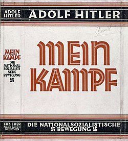 Hitler was Austrian by birth and came to power in Germany by way of a series of legal and extralegal maneuverings. His decidedly toxic message of racism and antisemitism is summed up in his manifesto, Mein Kampf, which he wrote while imprisoned in the 1920s after trying to lead an idiotic coup d'état against the Weimar Republic. The copyright was owned in the U.S. by Houghton Mifflin through 2015, and access may be illegal depending on your local copyright and censorship laws, so read it at your own risk. However, due to having been written in 1923, as of January 1st, 2019, it is now in the public domain.[2][3] The book may permanently damage your intelligence, because of its piss poor writing and ghastly bigoted sentiment.