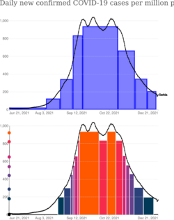 An equivalent way to introduce the Lebesgue integral is to use so-called simple functions, which generalize the step functions of Riemann integration. Consider, for example, determining the cumulative COVID-19 case count from a graph of smoothed cases each day (right).