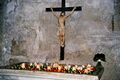 In the West, altar crosses and processional crosses began to be crucifixes in the 11th century, which became general around the 14th century, as they became cheaper. The Roman Rite requires that "either on the altar or near it, there is to be a cross, with the figure of Christ crucified upon it, a cross clearly visible to the assembled people. It is desirable that such a cross should remain near the altar even outside of liturgical celebrations, so as to call to mind for the faithful the saving Passion of the Lord."[19] The requirement of the altar cross was also mentioned in pre-1970 editions of the Roman Missal,[20] though not in the original 1570 Roman Missal of Pope Pius V.[21] The Rite of Funerals says that the Gospel Book, the Bible, or a cross (which will generally be in crucifix form) may be placed on the coffin for a Requiem Mass, but a second standing cross is not to be placed near the coffin if the altar cross can be easily seen from the body of the church.[22]