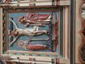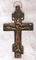 Western crucifixes may show Christ dead or alive, the presence of the spear wound in his ribs traditionally indicating that he is dead. In either case his face very often shows his suffering. In the Eastern Orthodox tradition he has normally been shown as dead since around the end of the period of Byzantine Iconoclasm.[12] Eastern crucifixes have Jesus' two feet nailed side by side, rather than crossed one above the other, as Western crucifixes have shown them since around the 13th century. The crown of thorns is also generally absent in Eastern crucifixes, since the emphasis is not on Christ's suffering, but on his triumph over sin and death. The S-shaped position of Jesus' body on the cross is a Byzantine innovation of the late 10th century,[13] though also found in the German Gero Cross of the same date. Probably more from Byzantine influence, it spread elsewhere in the West, especially to Italy, by the Romanesque period, though it was more usual in painting than sculpted crucifixes. It was in Italy that the emphasis was put on Jesus' suffering and realistic details, during a process of general humanization of Christ favored by the Franciscan order. During the 13th century the suffering Italian model (Christus patiens) triumphed over the traditional Byzantine one (Christus gloriosus) anywhere in Europe also due to the works of artists such as Giunta Pisano and Cimabue. Since the Renaissance the "S"-shape is generally much less pronounced. Eastern Christian blessing crosses will often have the Crucifixion depicted on one side, and the Resurrection on the other, illustrating Eastern Orthodox theology's understanding of the Crucifixion and Resurrection as two intimately related aspects of the same act of salvation.