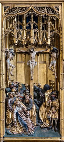 Altar panel of the Church of St. Peter and Paul in Weimar depicts the Crucifixion of Jesus with Lucas Cranach the Elder and Martin Luther standing on the right