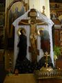 Eastern Christian liturgical processions called crucessions [citation needed] include a cross or crucifix at their head. In the Eastern Orthodox Church, the crucifix is often placed above the iconostasis in the church. In the Russian Orthodox Church a large crucifix ("Golgotha") is placed behind the Holy Table (altar). During Matins of Good Friday, a large crucifix is taken in procession to the center of the church, where it is venerated by the faithful. Sometimes the soma (corpus) is removable and is taken off the crucifix at Vespers that evening during the Gospel lesson describing the Descent from the Cross. The empty cross may then remain in the centre of the church until the Paschal vigil (local practices vary). The blessing cross which the priest uses to bless the faithful at the dismissal will often have the crucifix on one side and an icon of the Resurrection of Jesus on the other, the side with the Resurrection being used on Sundays and during Paschaltide, and the crucifix on other days.