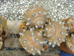 Tungsten carbide is used extensively in mining in top hammer rock drill bits, downhole hammers, roller-cutters, long wall plough chisels, long wall shearer picks, raiseboring reamers, and tunnel boring machines. In these applications it is also used for wear and corrosion resistant components in inlet control for well screens, sub-assemblies, seal rings and bushings common in oil and gas drilling.[36] It is generally utilised as a button insert, mounted in a surrounding matrix of steel that forms the substance of the bit. As the tungsten carbide button is worn away the softer steel matrix containing it is also worn away, exposing yet more button insert.