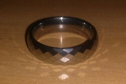 Tungsten carbide, typically in the form of a cemented carbide (carbide particles brazed together by metal), has become a popular material in the bridal jewelry industry due to its extreme hardness and high resistance to scratching.[46][47] Even with high-impact resistance, this extreme hardness also means that it can occasionally be shattered under certain circumstances.[48] Some consider this useful, since an impact would shatter a tungsten ring, quickly removing it, where precious metals would bend flat and require cutting. Tungsten carbide is roughly 10 times harder than 18k gold. In addition to its design and high polish, part of its attraction to consumers is its technical nature.[46] Special tools, such as locking pliers, may be required if such a ring must be removed quickly (e.g. due to medical emergency following a hand injury accompanied by swelling).[49]