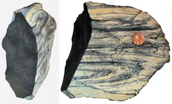 The Green River Formation is an Eocene geologic formation that records the sedimentation in a group of intermountain lakes in three basins along the present-day Green River in Colorado, Wyoming, and Utah. The sediments are deposited in very fine layers, a dark layer during the growing season and a light-hue inorganic layer in the dry season. Each pair of layers is called a varve and represents one year. The sediments of the Green River Formation present a continuous record of six million years. The mean thickness of a varve here is 0.18 mm, with a minimum thickness of 0.014 mm and maximum of 9.8 mm.[1]