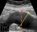 Ultrasonography in the sagittal plane, showing axial plane measure (dashed red line), as well as maximal diameter (dotted yellow line), which is preferred
