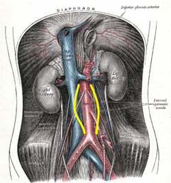 Gray's Anatomy with yellow lines depicting the most common infrarenal location of the AAA