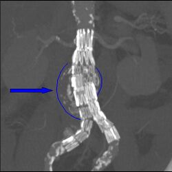 Abdominal aortic endoprosthesis, CT scan, original aneurysm marked in blue