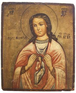 The patronage of women in childbirth is due to the traditional perception of the maternal beginning in the image of the Mother of God, which is emphasized by the etymological connection of her name with the word "birth". The Virgin Mary was usually approached with a request for help in difficult deliveries, on the day of the Nativity of the Virgin, pregnant women prayed for the easy release from the childbirth. The Virgin Mary was also perceived not only as the Mother of God, but also as the birth mother for all people. In this sense she in peasant consciousness correlated with the Mother of the raw earth. This relationship is also found in the traditional notions of swearing: in the popular environment it was believed that it offends the three mothers of man – the Mother of God, Mat Zemlya and the native mother. The Russians have a well-known saying: when one swears in foul language – "the Mother of God falls face down in the mud".[49]