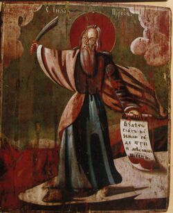 According to Slavic folk legends based on the bookish (biblical, bogomils) tradition, Elijah was taken alive into heaven. Until he was 33 years old, Elijah sat sitting and was healed and endowed with great power by God and saint Nicholas the Wonderworker (cf. bogatyr), after which he was taken to heaven (eagle), cf. the epic story of Ilya Murometz. The saint rides through the sky on a fiery (stone) chariot. According to Slavic beliefs, the sun is a wheel from the chariot of Elijah the Prophet, harnessed by fiery (white, winged) horses (V.-Slav.), or on a white horse (Bulgarian), which causes the thunder. The Milky Way is the road on which the prophet rides. In winter, Elijah rides a sleigh, so there is no thunder and thunder (Orlov.). The power of Elijah the thunderer is so great that it must be restrained: God placed on Elijah's head a stone of 40 dessiatin (Orlov.), bound him one arm and leg (Carpathian. ); Elijah's sister Ognyena Maria hid the day of his feast from him, or else he would beat the whole world with lightning for joy (Serbian); St. Elijah has only his left hand; if he had both hands, he would kill all the devils on earth (Banatgers). Before the end of the world, Elijah will descend to the earth and travel around the world three times, warning of the Last Judgment (Orlov.); he will come to earth to die or accept martyrdom by beheading on the skin of a huge ox, which grazes on seven mountains and drinks seven rivers of water; the spilled blood of the prophet will burn the earth (Carpathian). According to a legend from Galicia, the end of the world will come when Ilya "will fall with thunders so much that the earth will be rosipitsi i spalitsi"; cf. the Russian spiritual verse "On the Last Judgement," in variants of which the saint appears as the executor of the will of God, punishing the sinful human race.[55]