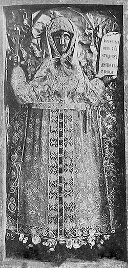 The cult of saint Paraskeva of Iconium is based on the personification of Friday, known in Russian as Pyatnitsa, as a weekday.[65] According to a number of researchers, some signs and functions of the main female deity of the East Slavic pantheon, Mokoshi, were transferred to Paraskeva Friday: connection with female works (spinning, sewing, etc.), with marriage and childbearing, with the earthly moisture.[65] Also correlated with Theotokos, Week and Saint Anastasia.[65]