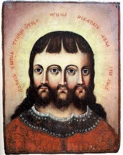 Mixed-hypostatic icons of the Trinity were borrowed from Catholic countries.[29] In Russia, due to their contradiction to the canon, they were officially banned. Such icons did not reflect Russian folk beliefs but were a subject of folk religion.[30] Popular Orthodoxy is a social and cultural phenomenon. It developed gradually with the spread of Christianity in Russia. At first, "the masses had to at least minimally master the ritual and dogmatic foundations of the new religion".[31]