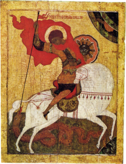 In the popular culture of the Slavs George the Victorious is called Yegoriy the Brave,[56] George is the protector of cattle, "wolf shepherd", "on spring he unlocks the Earth and releases the dew". In Southern Slavs Gergiev (Yuriev) Day is the main calendar boundary of the first half of the year, together with Mitrovdan it divides the year into two half-years – "Dmitrovsky" and "Yurievsky".[57] According to T. Zueva the image of Yegoriy the Brave in the folk tradition merged with the pagan Dazhbogom.[58]