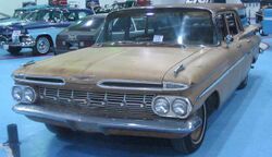 For the second time in as many years, Chevrolet again came up with a totally new car. From the front or rear the 1959 Chevrolets resembled nothing else on the road. From the headlights, placed as low as the law would allow, to the cats-eye tail lights, the 1959 Chevrolet was a brand new car with all new sheet metal. The most visual new change was the flat, wing shaped tailfins.[6] The car was built on a 119 in (3,023 mm) wheelbase and was 211 in (5,359 mm) long, which was 11 in (279 mm) longer than the 1957 model. This made Chevrolet the longest car in the low-priced range, whereas two years before it had been the shortest. In addition, the car was 3 in (76 mm) wider outside and had 5 in (127 mm) more width inside than it did in 1958, through the reduction of door thickness. The GM X frame had no side rails.[7]