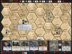 After picking which deck to play and choosing basic game settings, players are taken to the wasteland map where they place their initial tiles and headquarters. Since the game is single player, any other factions are controlled by computer opponents. After this, the terrain is generated and gameplay begins.