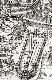 The privately owned circus and Horti were then inherited by Nero who made the circus public so he could invite them to cheer him on.[4] He also used both of these to lodge Romans made homeless by the great fire of 64. The circus was used in 65 to carry out mass executions of the Christians accused as scapegoats of the fire itself.[5] Because of this the area beyond the Tiber north of Trastevere was known as "Nero's meadows" until the end of the Middle Ages.[6]