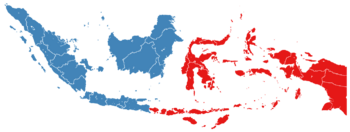 During the last stages of the Dutch colonial era, the area east of Java and Kalimantan was known as the Great East and later known as Eastern Indonesia. On 24 December 1946, the State of East Indonesia was formed covering the same area (excluding Western New Guinea). It was a component of the United States of Indonesia, and was dissolved into the unitary Republic of Indonesia in 17 August 1950.[2] Currently, Eastern Indonesia consists of 17 provinces: Bali, East Nusa Tenggara, West Nusa Tenggara, Central Sulawesi, Gorontalo, North Sulawesi, South Sulawesi, Southeast Sulawesi, West Sulawesi, Maluku, North Maluku, Central Papua, Highland Papua, Papua, South Papua, Southwest Papua, and West Papua.[3][4][5] Meanwhile, the region comprising the other 21 provinces in Sumatra, Java, and Kalimantan is known as Western Indonesia.[6]