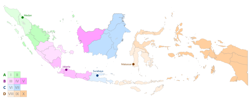 According to the National Development Planning Agency, Indonesia is divided into four main development regions, with each being led by the major cities of Medan, Jakarta, Surabaya, and Makassar.[7][8][9]