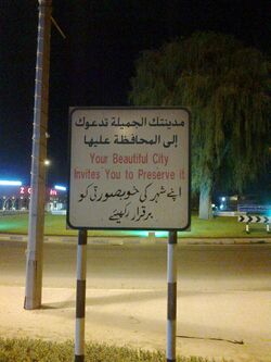A trilingual signboard in Arabic, English and Urdu in the UAE. The Urdu sentence is not a direct translation of the English ("Your beautiful city invites you to preserve it") or Arabic (the same). It says, "apné shahar kī Khūbsūrtīi ko barqarār rakhié, or "Please preserve the beauty of your city."