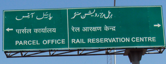 Urdu and Hindi on a road sign in India. The Urdu version is a direct transliteration of the English; the Hindi is a part transliteration ("parcel" and "rail") and part translation: "karyalay" and "arakshan kendra"