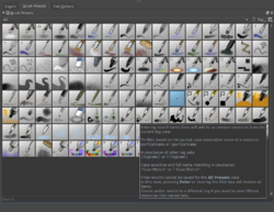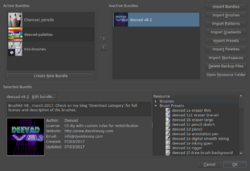 Krita's resource manager allows each brush or texture preset to be tagged by a user and quickly searched, filtered and loaded as a group. A collection of user-made presets can be packaged as "bundles" and loaded as a whole. Krita provides many such brush set and texture bundles on its official website.