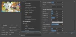 Filters included in a default installation: levels, colour adjustment curves, brightness/contrast curve, desaturate, invert, auto contrast, HSV adjustment, pixelise, raindrops, oil paint, gaussian blur, motion blur, blur, lens blur, colour to alpha, color transfer, minimise channel, maximise channel, top/left/bottom/right edge detection, sobel, sharpen, mean removal, unsharp mask, gaussian noise removal, wavelet noise reducer, emboss horizontal only/in all directions/(laplacian)/vertical only/with variable depth/horizontal and vertical, small tiles, round corners, phong bumpmap.
