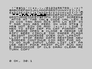 The ZX Spectrum character set is the variant of ASCII used in the ZX Spectrum family computers. It is based on ASCII-1967 but the characters ^, ` and DEL are replaced with ↑, £ and ©. It also differs in its use of the C0 control codes other than the common BS and CR, and it makes use of the 128 high-bit characters beyond the ASCII range.[1] The ZX Spectrum's main set of printable characters and system font are also used by the Jupiter Ace computer.