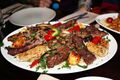 Mixed Arabic meat platter served on a bed of rice, in a restaurant in the United Kingdom