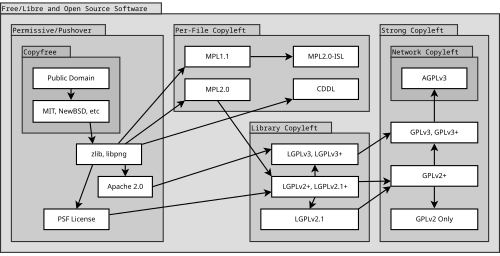 Although downloading an open-source module is quick and easy, complying with the licensing terms can be more difficult.[60] The amount of software dependencies means that engineers working on complex projects must often rely on software license management software in order to help them achieve compliance with the licensing terms of open-source components.[61] Many open-source software files do not unambiguously state the license, increasing the difficulties of compliance.[60] When combining code bases, the original licenses can be maintained for separate components, and the larger work released under a compatible license.[62] This compatibility is often one-way. Public domain content can be used anywhere as there is no copyright claim, but code acquired under almost any set of terms cannot be waved to the public domain. Permissive licenses can be used within copyleft works, but copyleft material cannot be released under a permissive license. Some weak copyleft licenses can be used under the GPL and are said to be GPL-compatible. GPL software can only be used under the GPL or AGPL.[63]