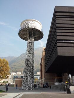 The beginnings of NOI Techpark dates back to 2007, thanks to the international competition of ideas that opens the way to the recovery of the area and the two former aluminium production plants, clearly rationalist[4] and placed under historical-monumental protection. The first tangible sign dates back to the following year, when, on the occasion of the seventh edition of the European Art Biennale "Manifesta", the Polish Mariusz Waras (alias M-City) decorated the iconic piezometric tower on the entrance square.[5] The project elaborated by Chapman Taylor Italia (Milan) and Studio CLEAA (Claudio Lucchin e Architetti Associati, Bolzano) with Andrea Cattacin (Trento) has added the Black Monolith to the original complex, right in front of the piezometric tower: an inclined parallelepiped covered in black oxidized aluminum foam panels, which emerges obliquely from the ground, inspired by the enigmatic totem of Stanley Kubrick's 2001 Space Odyssey.[6]