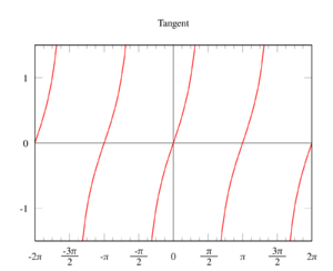 | Tangent | tan | [math]\displaystyle{ \tan \theta = \frac{1}{\cot \theta} = \frac{\sin \theta}{\cos \theta} = \cot \left(\frac{\pi}{2} - \theta \right) \, }[/math] |